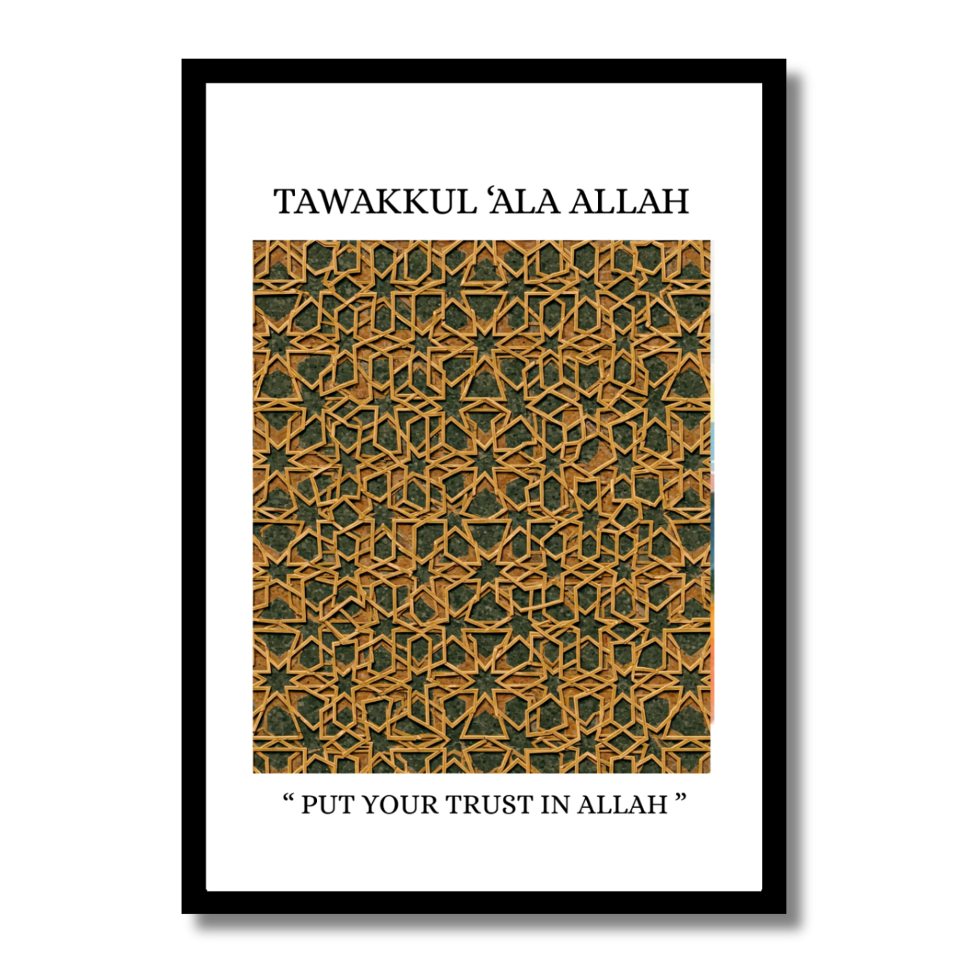 "Embrace faith with this framed 'Tawakkul 'Ala Allah' artwork. Featuring intricate Islamic geometric patterns and elegant Arabic calligraphy, it's a serene reminder to trust in Allah. High-resolution print on 300 GSM paper, framed in a sleek 1-inch black frame. Includes mounting kit