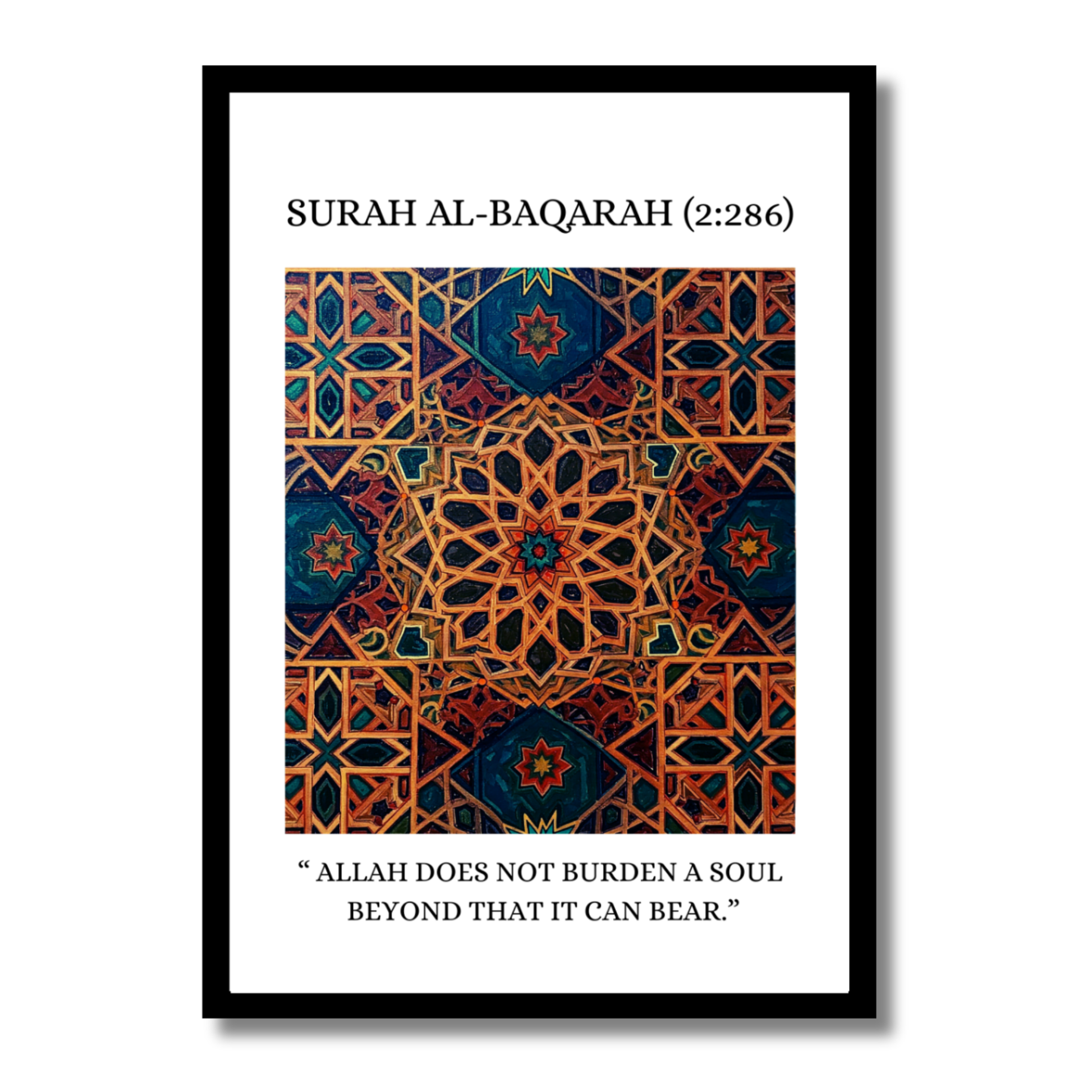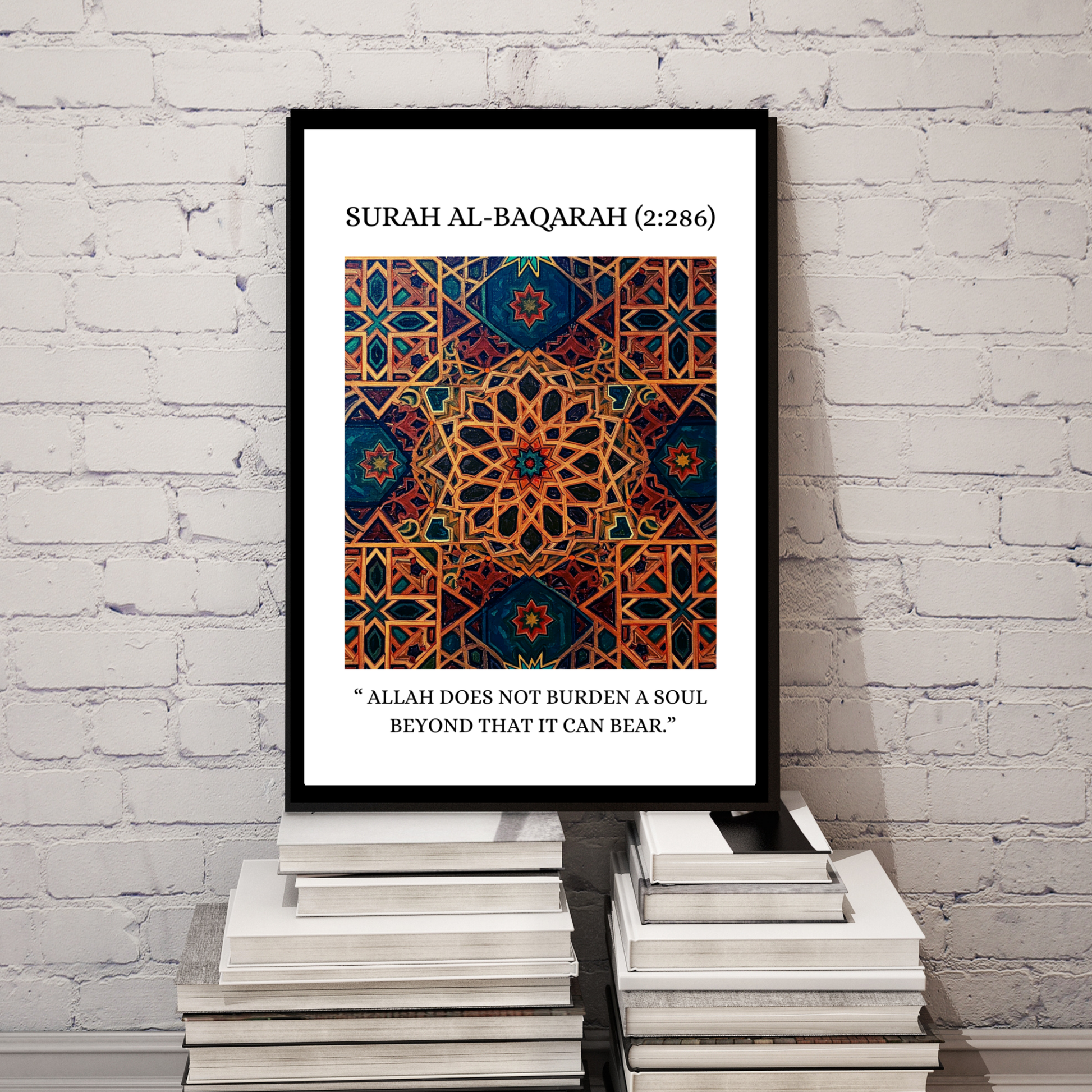 Invite tranquility into your space with this framed artwork showcasing Surah Al-Baqarah (2:286). The intricate geometric patterns, rendered in rich golden and deep blue hues, create a visual serenity, while the comforting Quranic verse offers spiritual solace. This piece, a high-resolution print on 300 GSM paper, is encased in a sleek black frame, making it a powerful reminder of divine understanding and relief
